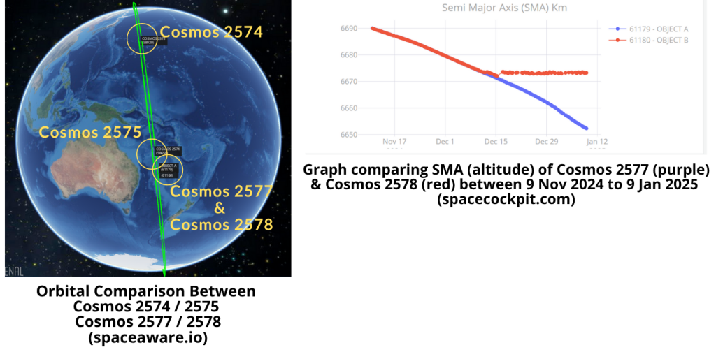 – Cosmos 2577/2578 are nearly co-planar with Cosmos 2574 (58658) and Cosmos 2575 (58929).