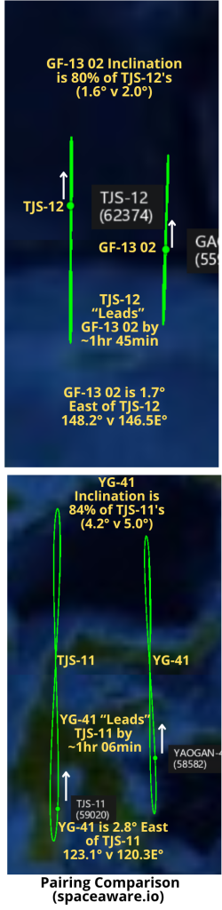 – Why China initially located SJ-25 “near” TJS-11 is an open question. Examining their orbits, SJ-25 does not get closer than 450km from TJS-11. TJS-11 is inclined 5.0° with a RAAN of 322.3°…it is NOT co-planar with SJ-25.