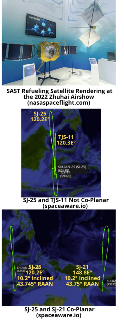 The fact SJ-25 is co-planar with SJ-21 strongly suggests SJ-21 is the intended refueling target. Both satellites were manufactured by the Shanghai Academy of Spaceflight Technology increasing the chances of collaboration between development/design teams. SJ-21 may have expended most of its onboard fuel during the debris mitigation demonstration and it may have been equipped for refueling in anticipation of SJ-25 development and launch. Time, and SJ-25 maneuvers, will tell.