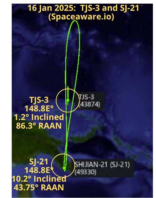 18 Jan: TJS-3 conducted a series of maneuvers resulting in its positioning in the neighborhood of SJ-21 at 148°E. While the TJS-3 has a different inclination and RAAN than SJ-21 (it is NOT co-planar) its positioning could be in preparation to support a re-fueling demonstration involving SJ-25 and SJ-21.