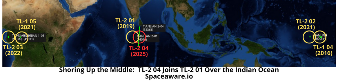 – China now has pairs of satellites operating over Africa (TL-1 05/TL-2 03), the Indian Ocean (TL-2 02/TL-2 04), and the Western Pacific (TL-1 04/TL-2 02). See graphic. (Editor’s note: inclination shown in graphic will likely change as this was the first observation of TL-2 04 in GEO).