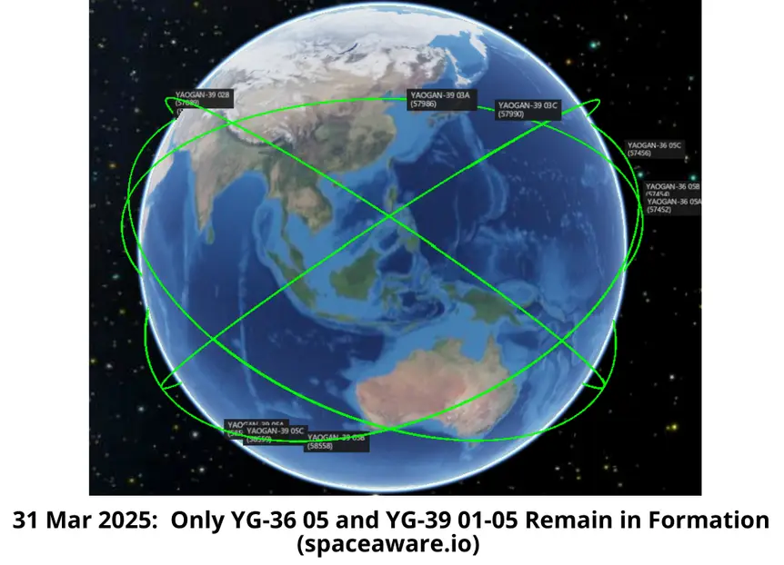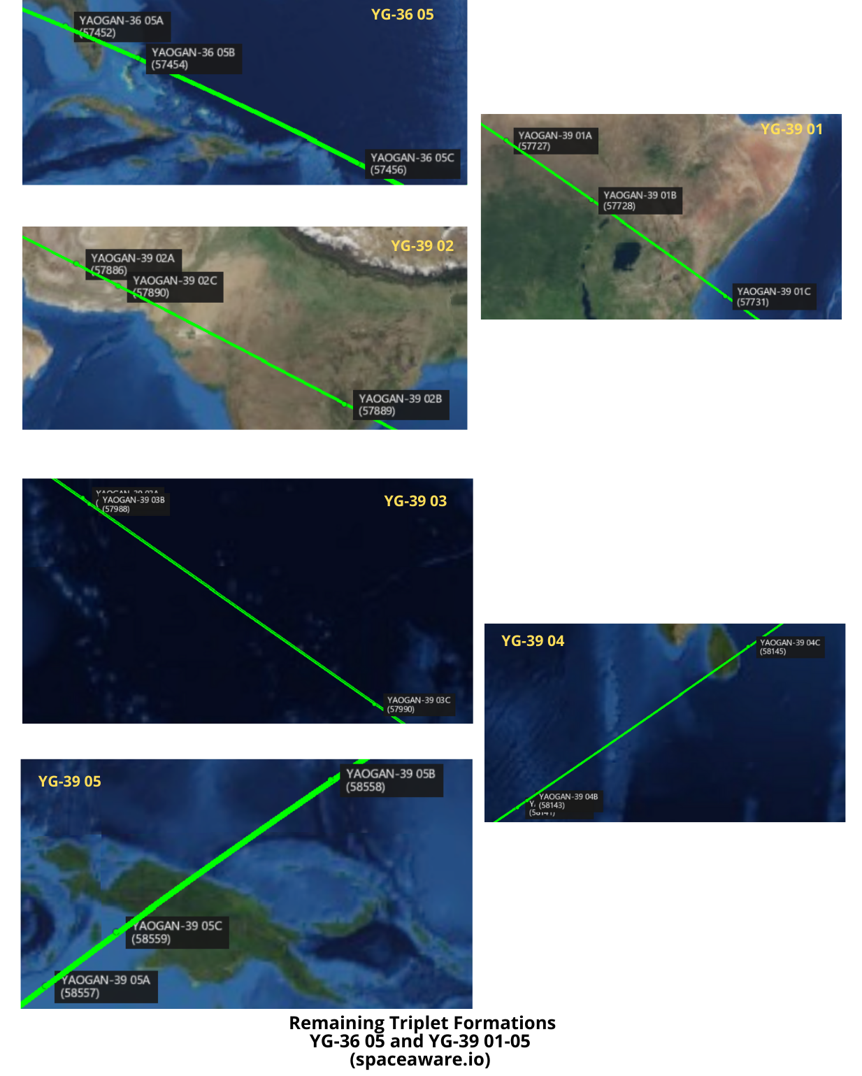 The 6 remaining Yaogan triplets remaining in formation are also those most recently launched. All five sets of Yaogan-39 triplets remain in formation (all launched between Aug-Dec 2023) as does the YG-36 05 (launched Jul 2023.)