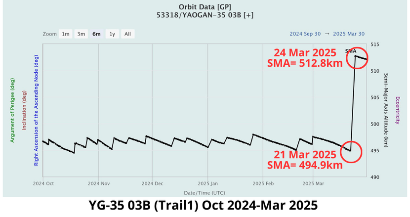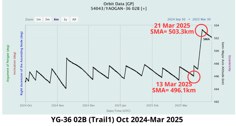 31 Mar: Between 18-30 March 2025, Chinese space operators significantly increased the average altitude for 9 of 10 of their Yaogan-35 and 36 (YG-35 & YG-36) Trail1 satellites. Specifically, China raised the average altitude for the Trail1 satellites for the following triplets: YG-35 01 (49390), 35-02 (52907), 35-03 (53318), 35-04 (53526), 35-05 (53763), 36-01 (53943), 36-02 (54043), 36-03 (54374) and 36-04 (54746). Only YG-36 05 remains in formation. There were no corresponding SMA increases from either the Lead or Trail2 satellites and as a result these formations rapidly dissolved as the Trail1 satellites now are traveling slower (have a longer orbital period) relative to their Lead and Trail2 counterparts. Operating at different altitudes also affects the rate of RAAN progression and the Trail1 satellites will no longer be co-planar with their partners if they remain at different average altitudes.