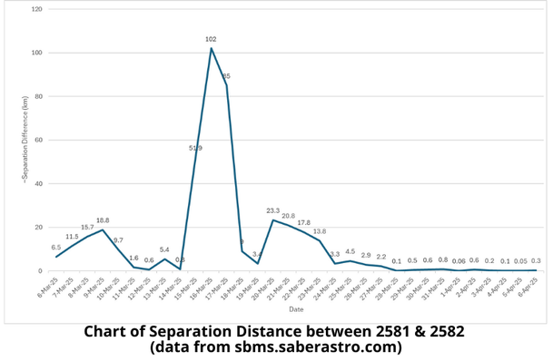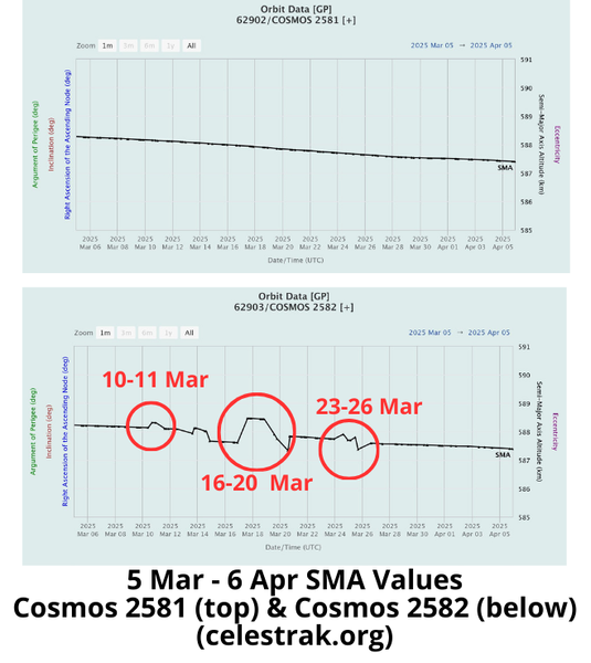 5 Apr: The rendezvous proximity operations between Cosmos 2581 (62902) and Cosmos 2582 (62903) continued. Here is the analysis we did for the Flash on 9 Mar 2025 which details the interactions between the three satellites from 13 Feb through 7 Mar 2025. This article details what we’ve seen from 8 Mar through 6 Apr 2025. Of note, Cosmos 2582 appears to be doing all of the maneuvering while Cosmos 2581 remains in its natural orbit. For its part 2583 has conducted limited maneuvers but is believed to have released an object (cataloged as “Object F” <63330>) on 18 Mar. This article is based solely on TLE data available on Celestrak.org, reporting provided by the Joint Commercial Operations (JCO) cell and orbit visualization from Space Cockpit.