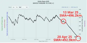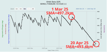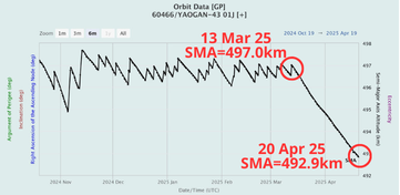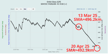The constellation began to change in mid-March as the average altitudes of YG-43 01B, 01D and 01J slid below 496km. In late-Mar/early-Apr YG-43 01A and 01G also had their average altitudes drop below the historical average. Looking at the graphs below it does not appear as if China is actively lowering the satellites, rather China appears to have stopped conducting the necessary station-keeping and the orbits are naturally decaying. The average altitudes continue to decline for all 5 (see graphs).
