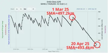 Chinese space operators have not maintained the SMA of 5 of the 9 Yaogan-43 01 (60458-66) satellites resulting in changing positions between the satellites and an extension of the entire 9 satellite train. Yaogan-43 01A (60458), 01B (60459), 01D (60461), 01G (60464) and 01J (60466) are now orbiting at average altitudes below 495km and ~2km lower than their other YG-43 01 satellites.