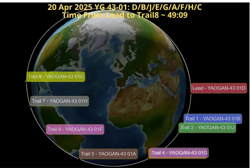 The order of the YG-43 01 satellites has changed significantly in the past 3 weeks with the satellites flying at lower altitudes steadily moving toward the front of the formation. As of 20 Apr 2025 the satellites are now in the following order (mover satellites in RED): 1) Lead: 01D; 2) Trail1: 01B; 3) Trail2: 01J; 4) Trail3: 01G; 5) Trail4: 01E; 6) Trail5: 01A; 7) Trail6: 01F; 8) Trail7: 01H; and 9) Trail8: 01C. The average altitude for the 5 “mover” satellites on 20 Apr 2025 was ~493.36km; the average for the other 4 satellites was 497.05km.