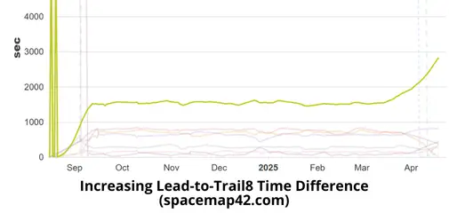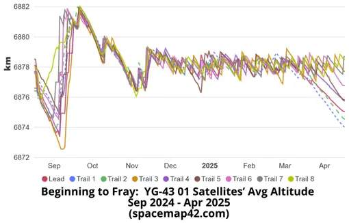 I looked at the YG-43 02/03 (60945-50 & 61617-19) constellation and do not see a similar pattern. All 9 satellites continue to maintain their average altitudes within 0.5km of one another and the time separation between Lead and Trail8 remains within historical averages. Of course these satellites launched later than YG-43 01, with 6x YG-43 02 satellites launching on 3 Sep 2024 and 3x YG-43 03 satellites launching on 23 Oct 2024. The 9 satellites organized into their current order on ~8 Jan 2025. I’ll keep checking in to see if a similar situation develops at the 6 month point (so early Jun 2025).