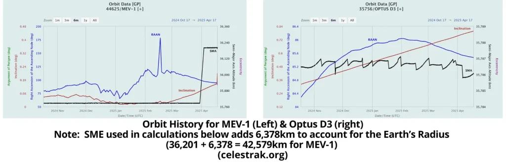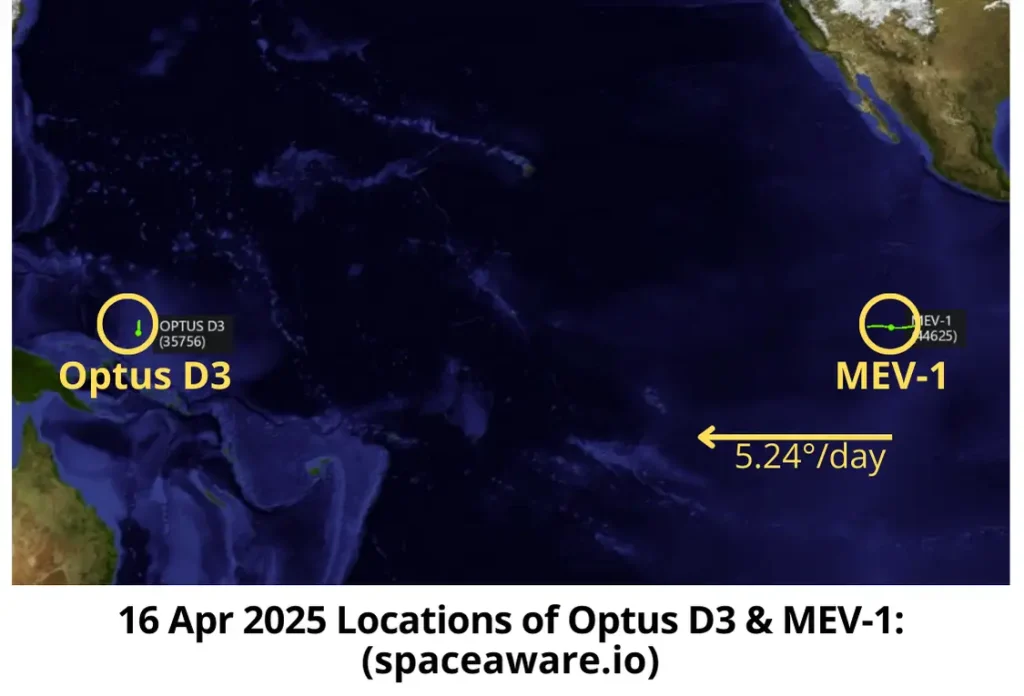– Optus D3 is currently at 156.1°E longitude. Barring any additional maneuvers from either satellite, MEV-1 will arrive at Optus D3’s location on ~04 May 2025.