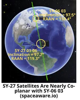 -The SY-27 and SY-06 03 orbits are also very similar. SY-06 03 is orbiting slightly lower, at an average altitude of 974km and is inclined 99.5°. SY-06 03 has a RAAN offset of only ~1° compared with the SY-27 satellites.