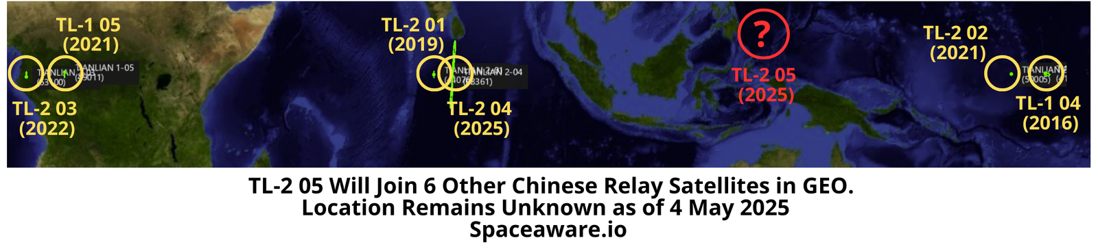 – The addition of Tianlian-2 05 brings the total to 7 operational Tianlian relay satellites. This is China’s second Tianlian launch in 2025. There were zero TL launches in 2023 or 2024.