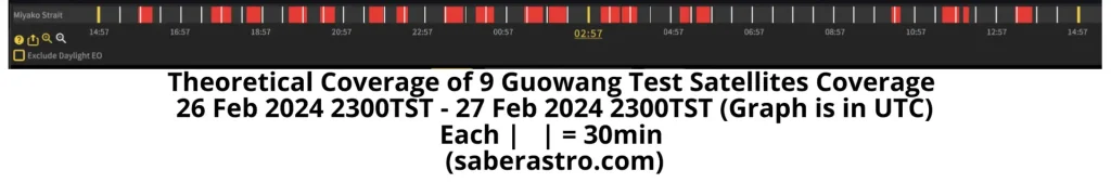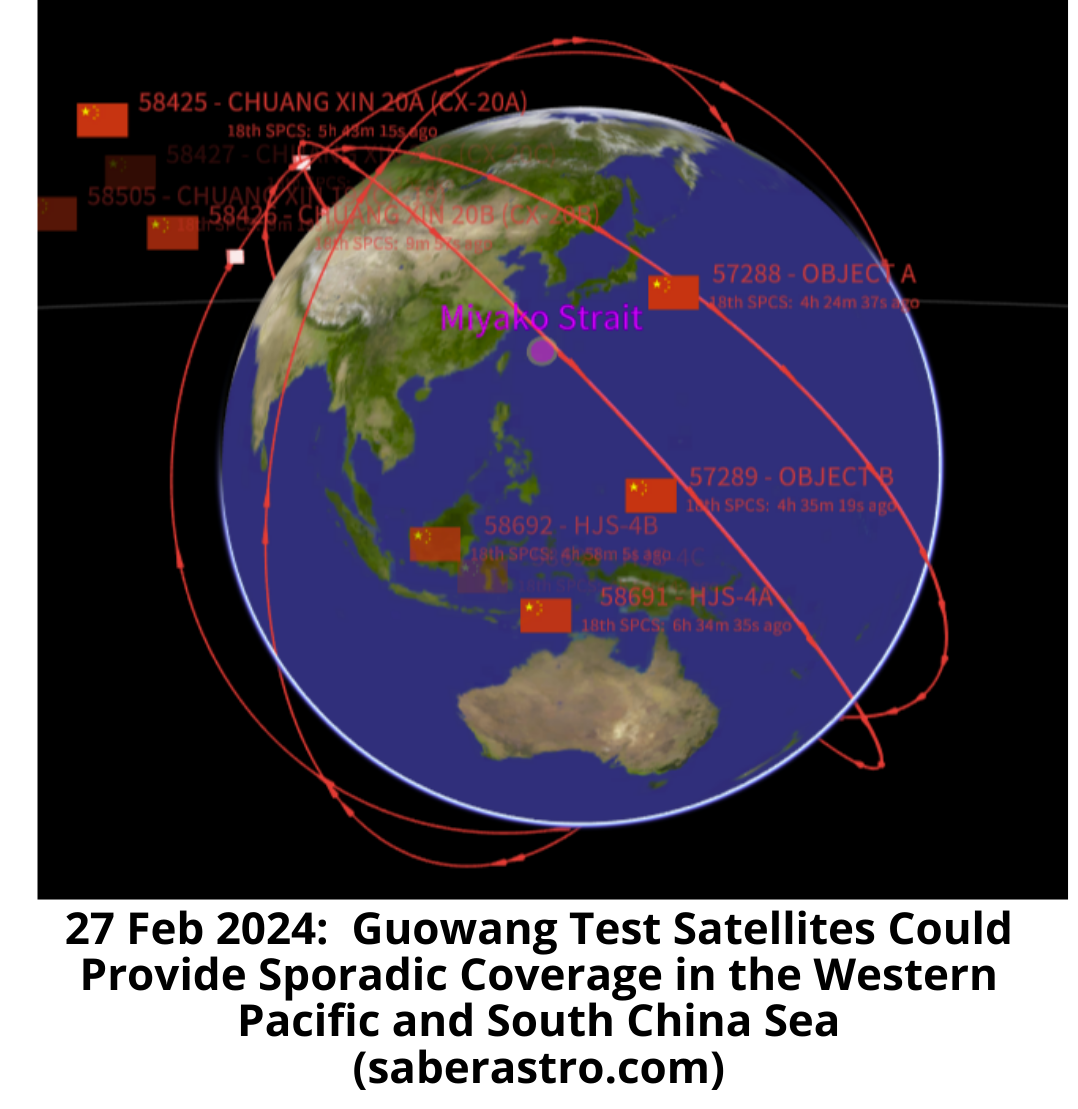 - Based only on the orbital information available on 27 Feb 2024 it appears China would have had Guowang coverage of the Miyako Strait for ~7 hours and 50 minutes on that day.
