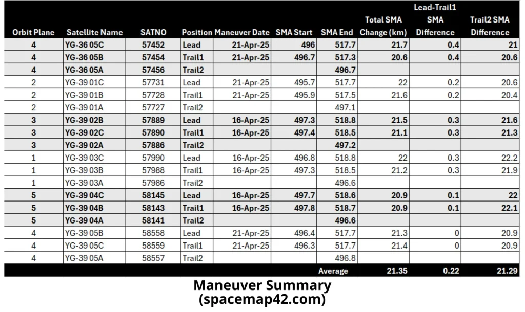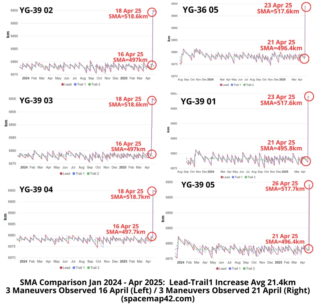 – China appears to have conducted two sets of maneuvers. Western observers noted three sets of the Lead/Trail1 satellites (39 02, 39 03 & 39 04) increased their SMA on 16-17 April while the other three sets (36 05, 39 01 & 39 05) increased their SMA on 21-22 April.