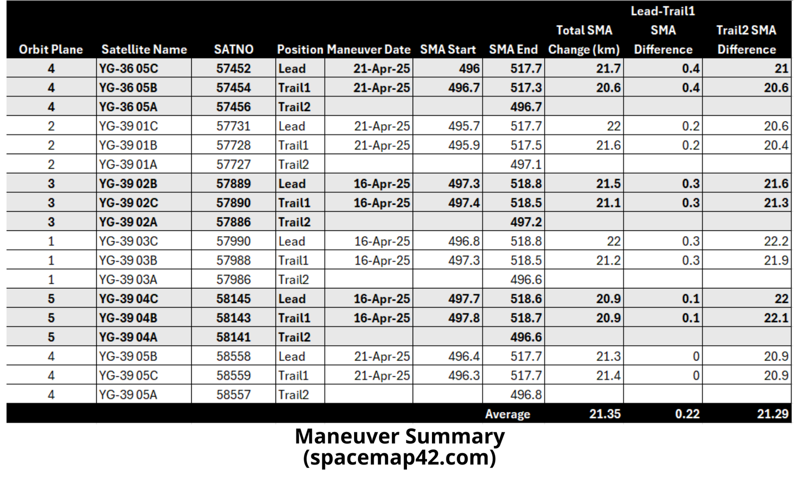 – The maneuvers appear to have been very precise. All of the Lead and Trail1 satellites increased their SMA an average of 21.35km to ~518km. All Trail2 satellites maintained their average altitudes of ~497km.