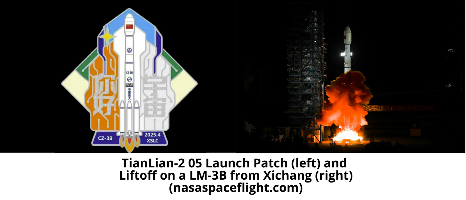 27 Apr: China launched a Long March-3B from Xichang carrying the TianLian-2 05 (TL-2 05) (63662) relay satellite to Geosynchronous Transfer Orbit. TL-2 05 is the fifth satellite of China’s second-generation data relay satellite system and joins TianLian-1 04 & 05 and TianLian-2 01, 02, 03 and 04 to provide global data relay and transmission services. The relay satellite network allows near real time communications between China Space Station (and other LEO satellites) and their mission control centers. As of 4 May the satellite remained unlocated. Launch Video.