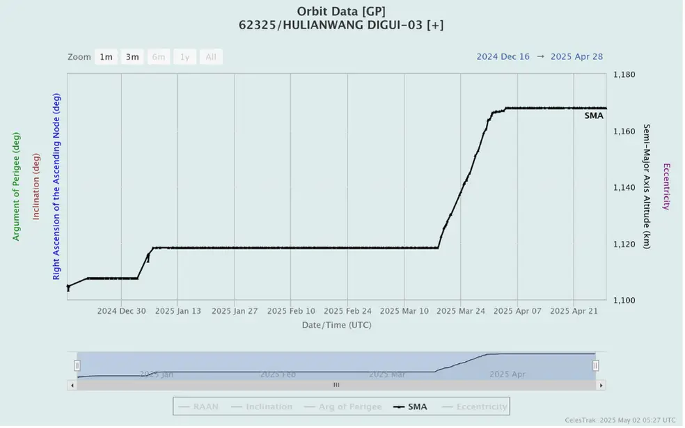 – This time, instead of Trail2 decreasing its SMA, China increased the SMA for Lead and Trail1 satellites. The result is the same, RAAN progression for Lead and Trail1 will differ from Trail2. Once China has achieved the desired RAAN offset they can then lower the SMA for Lead and Trail1 to restore the formation.
