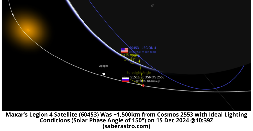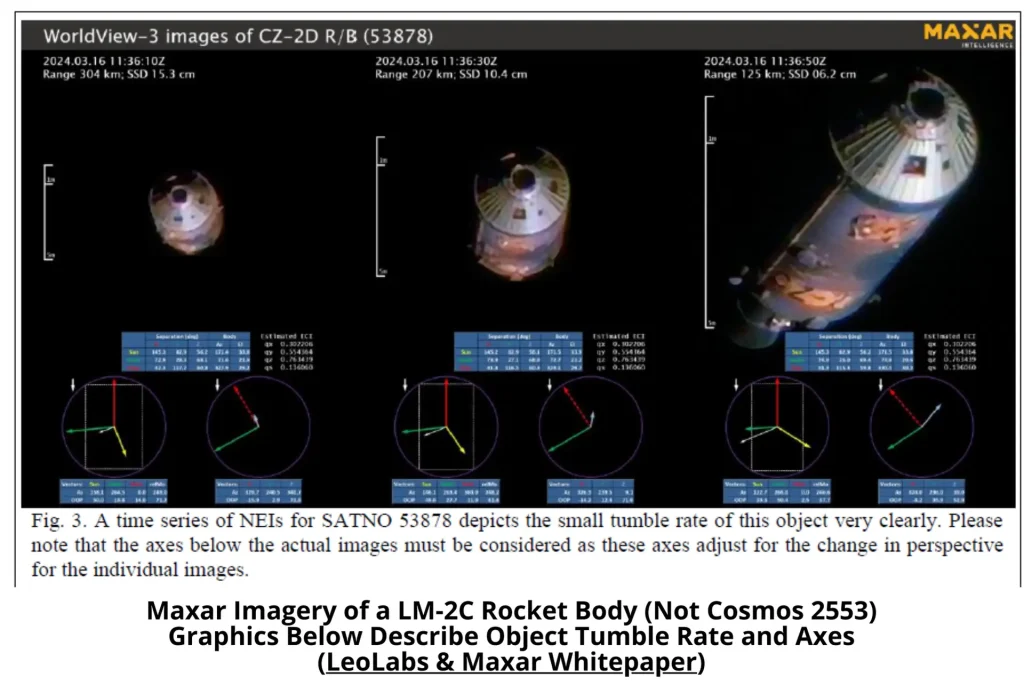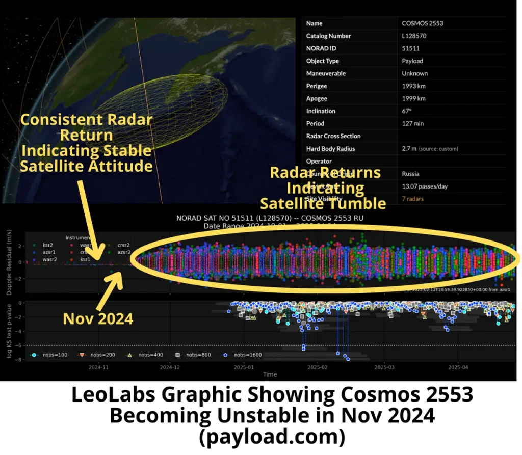 25 Apr: Various news sources reported that the Russian Cosmos 2553 (51511) satellite appeared to become unstable in November 2024. Russia launched Cosmos 2553 on 5 Feb 2022 (editor’s note: this was less than 3 weeks prior to Russia’s invasion of Ukraine and 82 days after Russia’s destructive Nudol ASAT test) and soon-after there were rumors that the satellite was potentially a test of a nuclear armed anti-satellite weapon (although there have been no reports that Cosmos 2553 actually has a nuclear weapon on board.) Secure World Foundation did an excellent article which you should read. LeoLabs recently released data indicating its (LeoLabs) space tracking radars had detected Cosmos 2553 had become unstable in November 2024. In mid-December the LeoLabs hypothesis was confirmed with optical imagery from Maxar satellites.