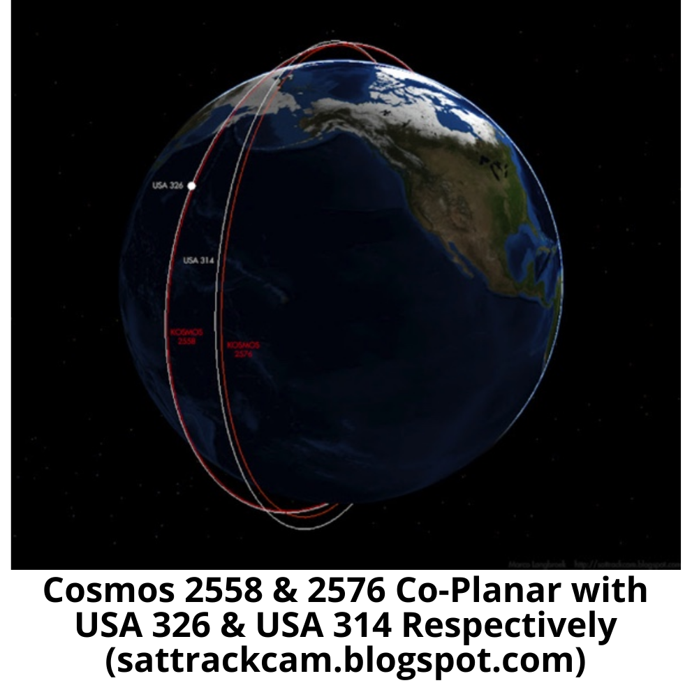 - Russia has not provided any details about Cosmos 2558 & 2576, but all indications are that they are of the same type as Cosmos 2519 & 2542, the only difference with the two earlier missions being that they have so far not released any subsatellites. They have been conducting maneuvers on a regular basis to ensure that their orbits remain synchronized with those of the American satellites, although a new series of orbit corrections by Cosmos-2576 in February are reported to have moved it out of plane with USA 314.