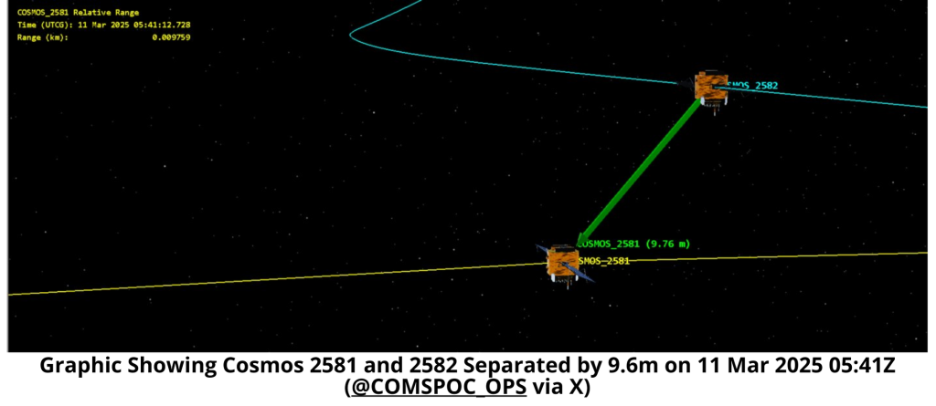 - Finally, three satellites (Cosmos 2581, 2582, and 2583) launched together this February also have all the hallmarks of being on some type of inspection mission. The Cosmos-2581/2582 pair has been flying in tandem since early March, coming as close as about 50 meters. Cosmos 2583 passed very close to them in early March and is now flying well ahead of them. It released an object, so far unidentified, on March 18.