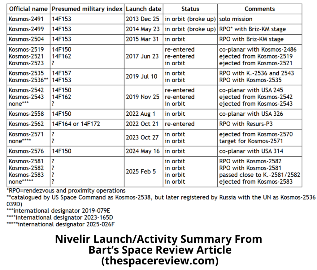 28 Apr: The Space Review published another tremendous article from Bart Hendrickx in which Bart takes a look at the history of the Russian inspector/anti-satellite Nivilir development and testing. I’ve included excerpts below to capture Bart’s description of Nivilir flight history. As is the norm for Bart’s articles, there is a ton of additional details in the article which you should read in its entirety.