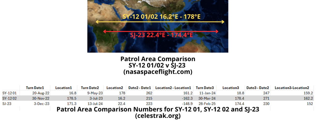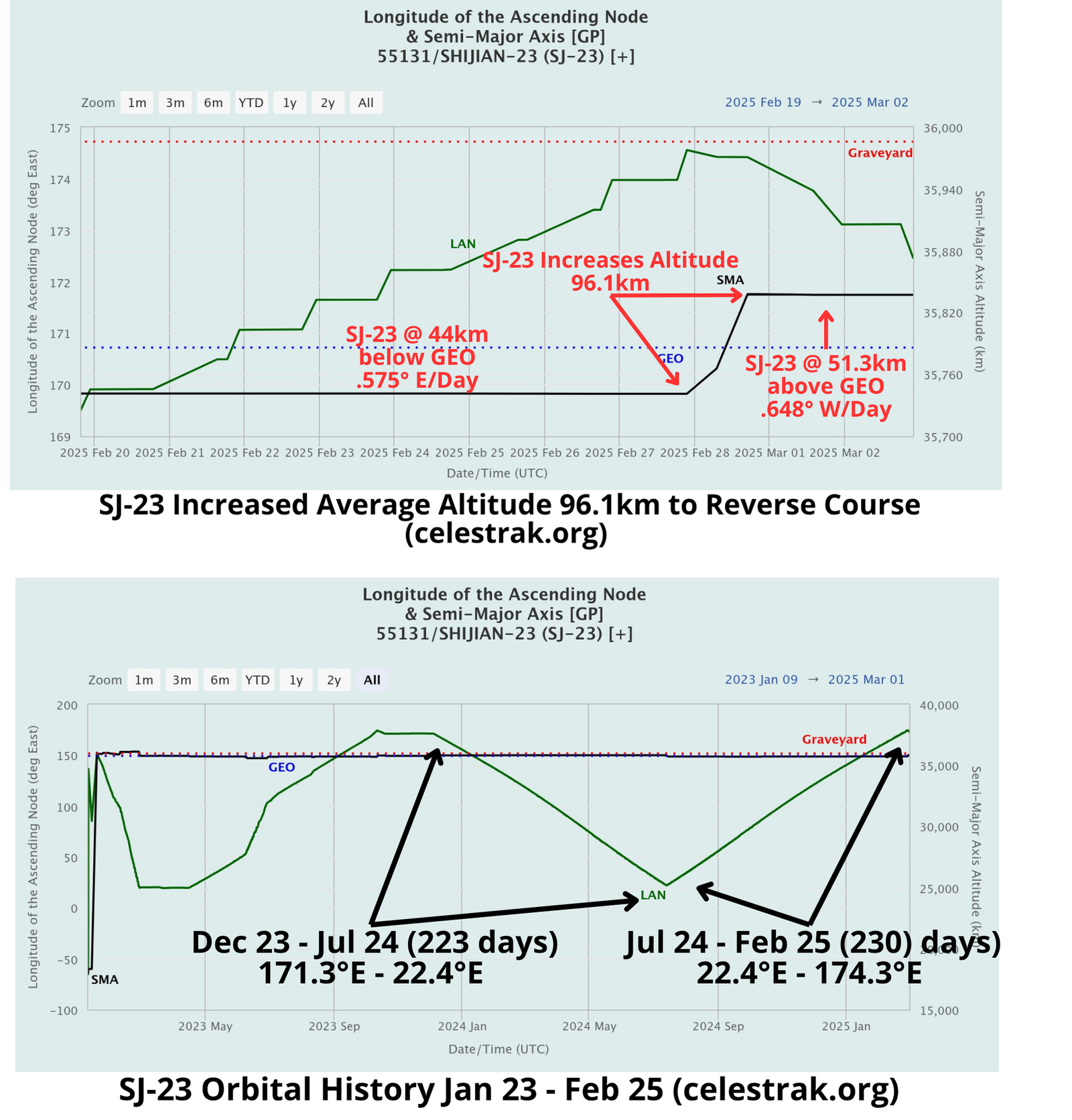 28 Feb 2025: It appears SJ-23 (55131) reached the easternmost limit of its GEO wandering and has increased its SMA to initiate a westward drift. I took the opportunity to compare SJ-23’s pattern of life with China’s other two GEO wanderers, Shiyan 12-01 and 12-02 (50321 & 50322).