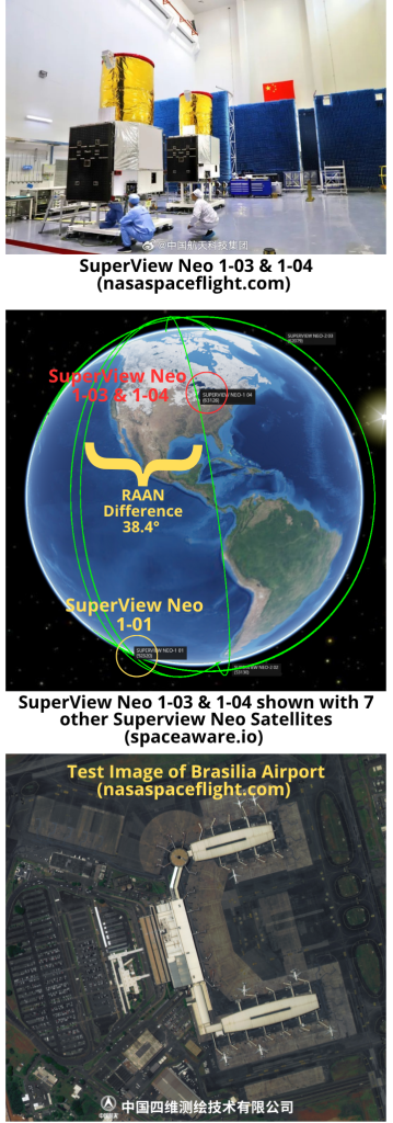 – Neo 1-03 and 1-04 are not co-planar with any other Superview Neo satellites. They all share similar average altitude and inclination, however are distributed over 5 orbital planes. Neo 1-03/04 have a RAAN offset 38.4° east of the Neo 1-01/02. (see graphic).