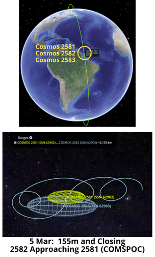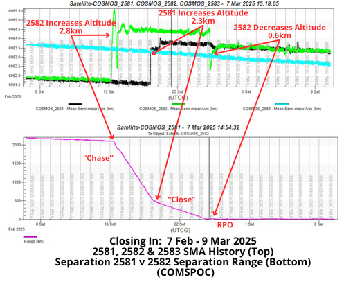 7 Mar: Since launching Cosmos 2581 (62902), Cosmos 2582 (62903) and Cosmos 2583 (62904) on 5 Feb 2025, Russia has maneuvered 2581 and 2582 into formation with one another. On 5 Mar the 2 satellites briefly came within <100m from one another. For its part, Cosmos 2583 has yet to maneuver, however it is flying at a slightly lower altitude than the 2581/2582 pair and passed both satellites on 7 Mar with a point of closest approach of <1km. The situation continues to evolve, but I worked with the COMSPOC team to analyze the orbital activities of all three satellites from 13 Feb through 7 Mar. Watch COMSPOC video of 2581/2582 Close Approach. Watch COMSPOC video of 2581/2582/2583 Close Approach.