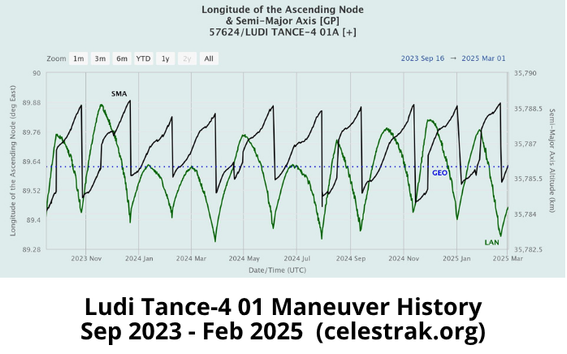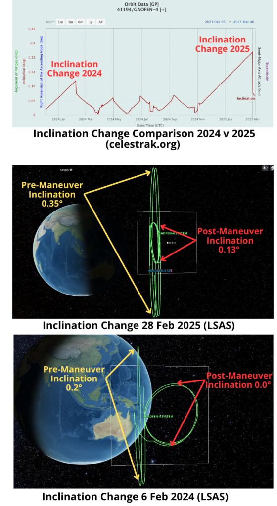 27 Feb – 1 Mar: China made an inclination adjustment for Gaofen-4 (41194), its first Geostationary based imaging system. GF-4 is entering its 10th year on orbit (it was China’s “Holiday Launch” on 28 Dec 2015) and this maneuver appears to be for station-keeping. Thank you to Robin Planell of LSAS for his assistance.