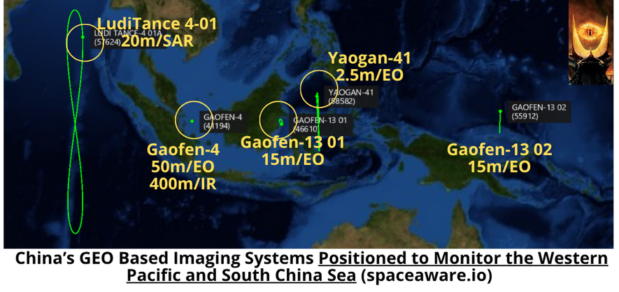 – GF-4 is China’s first GEO based imaging satellite and is believed to have a 50m resolution. From its position at 105.7°E GF-4 can keep a watchful eye on the Western Pacific and assist with tracking US aircraft carrier battle groups operating in the area.