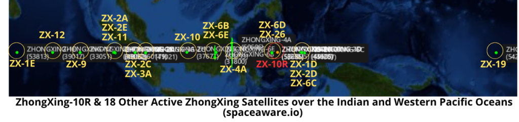 4 Mar: China’s ZhongXing (ChinaSat)-10R satellite (63075) has been cataloged at 126°E longitude. This puts the satellite in the general vicinity of ZhongXing-6D (52255, launched in 2022) and ZhongXing-26 (55686, launched in 2023). Orbital inclination is 0.1° which is consistent with other ZhongXing spacecraft. There are now 19 active ZhongXing satellites on orbit, all between the eastern Indian Ocean through the western Pacific with the heaviest concentration over the South China Sea.16