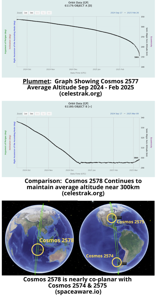 28 Feb: Cosmos 2577 (61179) re-entered the Earth’s atmosphere on 26 Feb. The satellite’s demise came just 5 months after its launch with Cosmos 2578 (61180) (which remains in orbit). During its 5 months on orbit Cosmos 2577 does not appear to have made any maneuvers.