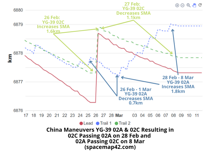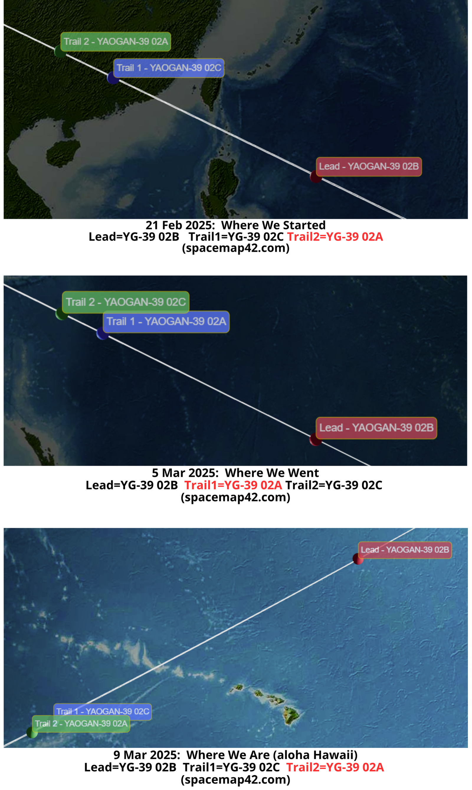 From October 2023 – late-February 2025 YG-39 02B was lead and YG-39 02C in Trail1 and YG-39 02A was Trail2. From 26 Feb – 4 Mar China increased the average altitude of YG-39 02C while decreasing the average altitude of YG-39 02A. On 28 Feb YG-39 02A passed YG-39 02C and became the Trail1 satellite. This condition lasted until 8 Mar, when 02C passed 02A to return to the Trail1 position.