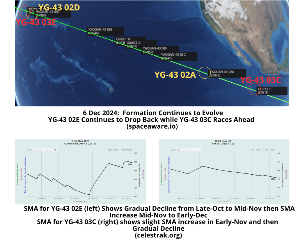 6 Dec: The 9 co-planar satellites that make up the YG-43 02 and 03 “formation” continues to change. You may recall that YG-43 02E (60949) decreased its altitude (SMA) in late-October and as a result went from being the final (Trail8) satellite at the end of the formation to briefly being in the second position just behind what was then the lead satellite YG-43 02A (60945). As we noted in the last Flash, YG-43 02E then raised its SMA nearly 7km bringing it to a higher orbit relative to the other 8 YG-43 02 and 43 03 spacecraft. YG-43 02E remains at a slightly higher orbit and has resumed its Trail8 position at the end of the YG-43 02 & 03 formation. Another change has also occurred at the front of the formation, with YG-43 03C (61619) replacing YG-43 02A as the lead satellite. YG-43 03C is currently orbiting with an SMA of 495.2km which is 1.6km lower than the YG-43 02A satellite.