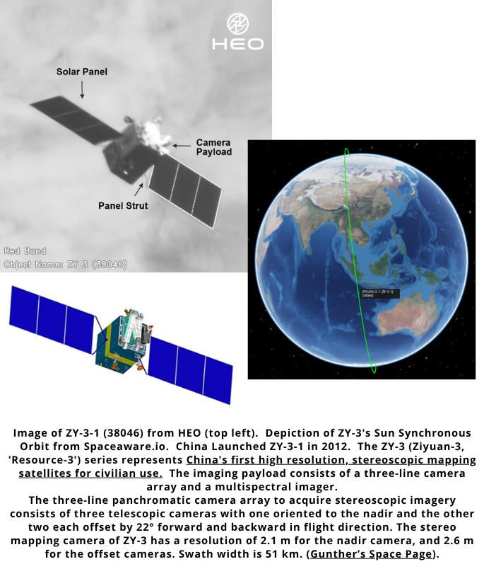 – China Sewei is likely experimenting with cross-cueing satellites for optimal collection with the high resolution Superview NEO-1 01 (52320) and the wide swath Superview NEO-3 01 (59510). The wide swath satellite leads the high resolution satellite by ~2min13sec. In this “formation” the wide swath (lower resolution) satellite can identify possible objects of interest which could then be confirmed by an image from the high resolution satellite.