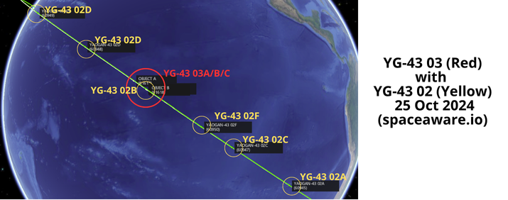 – I will continue to monitor the YG-43 03 satellites to determine if they are integrated into the YG-43 02 “formation.” China launched YG-43 03 into the middle of the YG-43 02 train. As of 25 Oct 2024 none of the YG-43 03 satellites has maneuvered.