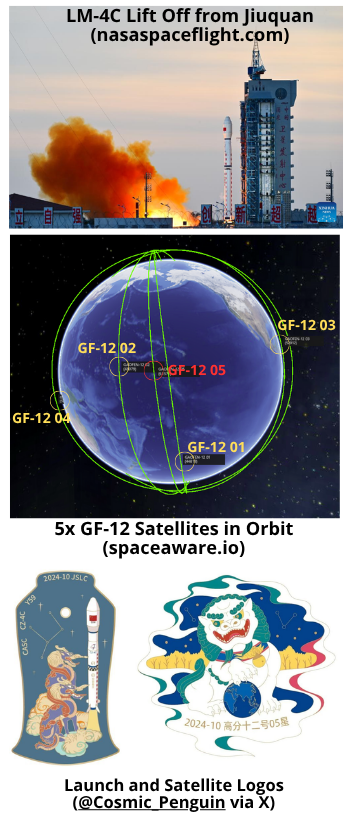 16 Oct: China launched a Long March-4C (LM-4C) with Gaofen-12 05 (61571) synthetic aperture radar (SAR) imaging satellite from Jiuquan. According to official sources, Gaofen-12 05 entered the planned orbit successfully and “will be used in a variety of fields including land surveys, urban planning, road network design, crop yield estimation and disaster relief”. Launch Video.