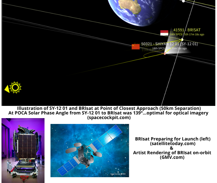 25 Oct: One of China’s suspected inspection satellites, Shiyan- 12 01 (SH-12 01/50321) came within 50km of Indonesia’s BRISAT (41591). At the point of closest approach the lighting conditions were optimal (solar phase angle (SPA) >130°) for SY-12 01 to image BRIsat. SPA remained >130°optimal for ~15 minutes when the satellites were ~85km apart.