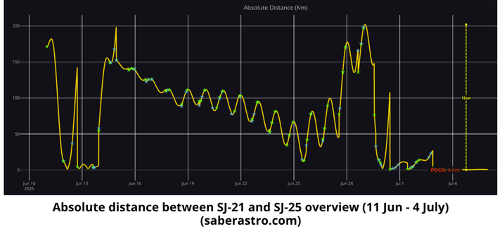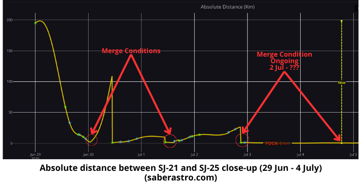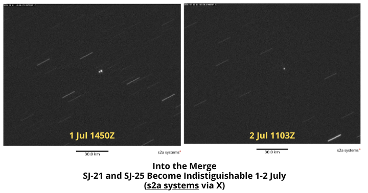 21 June – 4 July: China continues to maneuver both SJ-21 (49330) and SJ-25 (62485) in extremely close proximity with one another and have likely made several docking attempts. The two satellites entered into merge conditions on 2 July and remain in that condition through the time of this report (4 July). The Joint Commercial Operations Cell (JCO) noted potential docking as of 2 Jul at 1108Z. Due to resolution limitations of ground based telescopes and other collection methods we will not know if SJ-25 has successfully re-fueled SJ-21 unless China releases a statement or we begin to see large maneuvers from SJ-21. Watch 30 June merge maneuvers video from s2a systems.