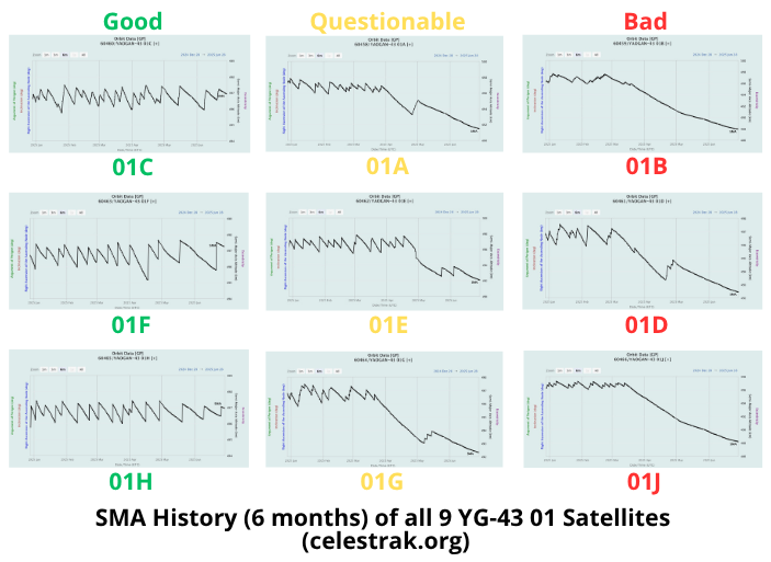 -YG-43 01 remained in stable configuration until mid-March 2025 (almost exactly 6 months post launch). Beginning on 12 March China began to vary the maneuvering for several of the satellites.