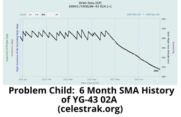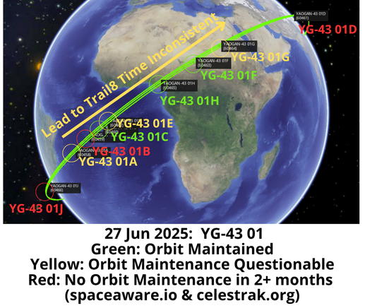 27 Jun: While we’re on the subject of China’s YG-43 satellites, I thought it would be interesting to take a look at the 6 YG-43 02 satellites (60945-60950) and 3 YG-43 03 satellites (61617-61619). Recall that China launched the YG-43 03 satellites into a co-planar orbit with YG-43 02 making another 9 satellite formation in Oct 2024. China has maintained the orbits for 8 of the 9 satellites and all are maintaining their relative positions with one another. For these 8 satellites the average SMA is 496.8km with an average SMA variance is just 350m. The one exception is YG-43 02A (60945) which has not maneuvered in over 70 days (last maneuver was 19 Apr 2025). From Oct 2024 – April 2025 02A had been the lead satellite for the formation. However, without maintaining its orbit 02A’s average altitude has decreased to 489.8km and it now has a shorter orbital period than the other 8 satellites and is slowly lapping the formation. 02A also has a growing RAAN offset with the formation (currently at ~0.83°) and is no longer co-planar. Without 02A in the formation the duration from Lead to Final Trail satellite has decreased from ~15-20 minutes to ~ 12-13 minutes.