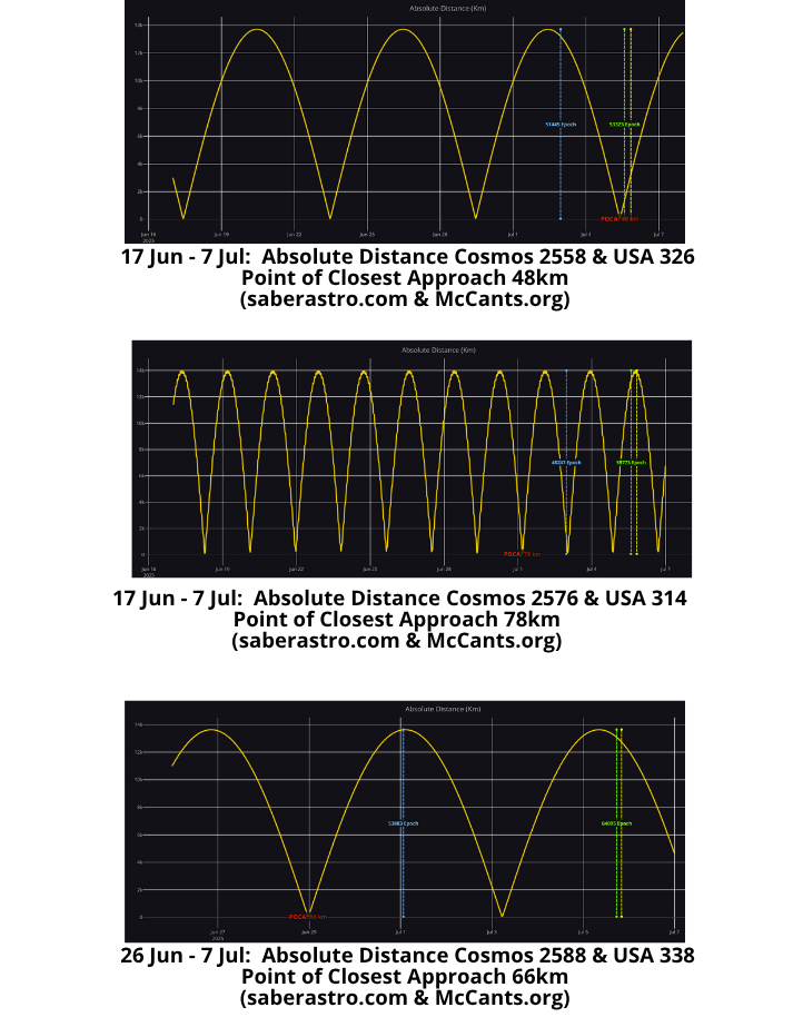 From 26 Jun – 3 Jul Cosmos 2558 and Obj C were separated by 70-150km. After reducing Obj C’s average altitude on 3 Jul the satellites began to separate and will continue to do so as Obj C has a shorter orbital period than Cosmos 2558. As of 5 Jul the two objects were separated by over 4,000km. Eventually Obj C will lap Cosmos 2558 and they will have another close approach.