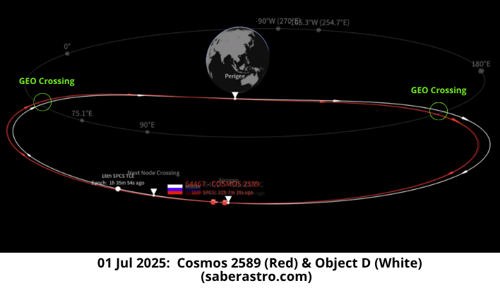 – As of 5 July it remains unclear if Russia intends to follow a similar maneuver sequence with either Cosmos 2589 or Object D. The maneuvers on 27-29 June did reduce the orbits’ eccentricity while increasing perigee values, however they also increased the apogee…opposite of what is necessary to bring the spacecraft into GEO.