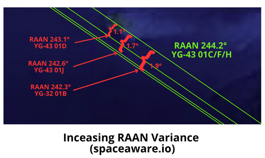 Editor’s Comment: We do not know the specific mission or capabilities of the YG-43 01 satellites. However, we do know that China launched them into a specific orbit and operated them in a well-maintained formation for 6 months. Beginning in mid-March the formation began to devolve and only 3 of the 9 satellites are now maintaining their relative positions with one another. If China had been using inter-satellite links to cross-cue between the 9 satellites, that capability is now sporadic at best as 6 of the 9 satellites have shorter orbital periods and are now lapping the 3 satellites maintaining their 497km average altitudes. As we’ve discussed before, operating at different average altitudes also generates a slight difference in RAAN procession and eventually the satellites will no longer be co-planar. This has already happened with YG-43 01 as there is now a RAAN variance of 1.9° between 01B and the three nominal satellites (01C, F & H).