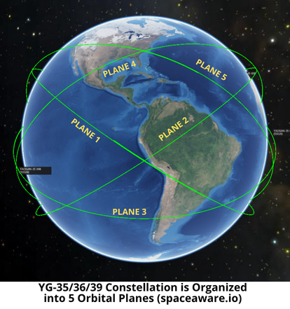 – The YG-35/36/39 constellation operates in 5 orbital planes with each orbital plane containing 3 triplets (9 satellites total per plane).