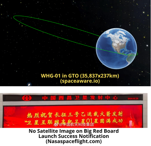 – As of 8 March available space catalogs continued to show WHG-01 in GTO. Orbital characteristics will help estimate the satellite’s mission 🤞. Look for further updates in future editions of the Flash.