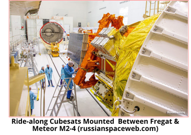 – Meteor in a 812 x 823 km x 98.6 deg orbit. Two objects are in 730 x 750 km; four in 503 x 750 km; 14 in 485 x 509 km orbit, reflecting multiple orbit changes by the Fregat stage prior to its deorbit.