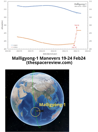 4 Mar: Article from the Marco Langbroek examing the orbital maneuvers North Korea’s first military reconnaissance satellite, the Malligyong 1. After the 21 Nov 2023 launch, initial western responses were skeptical, stating that the satellite, although it successfully reached orbit, was nevertheless non-functional. However, starting on 19 Feb, Malligyong-1 began showing unambiguous signs of life. From 19-24 Feb 2024, the satellite performed five consecutive small orbit raising maneuvers, one each day. Excerpts Below.