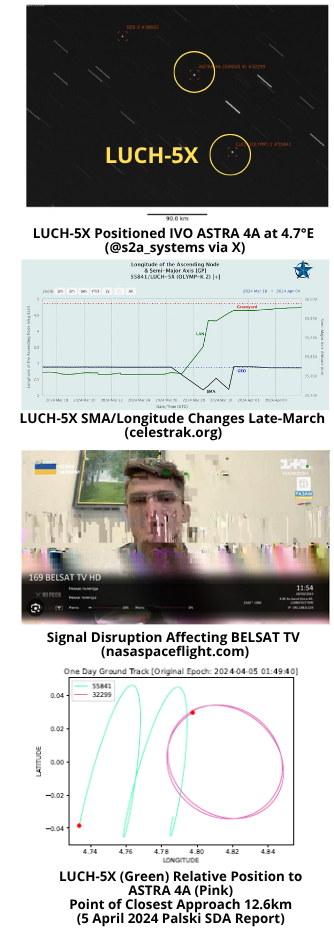 5 Apr 2024: After maintaining its orbit at 2.63°E from 5 Dec 2023 – 26 Mar 2024 (and in vicinity of EUTE KONNECT VHTS), Russia decreased LUCH-5X altitude ~47km on 27 Mar, drifted east for 2-3 days, and rejoined the GEO belt on 30 Mar at 4.7°E. LUCH-5X is now in vicinity of ASTRA 4A which carries broadcast television for Ukraine. ASTRA 4A was jammed by Russian sources (likely from the ground) on 28 March. It appears Russia was able to temporarily disrupt a Ukrainian United News telethon and content from other broadcasters and replace with Russian propaganda content.