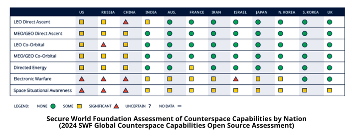 2 Apr 2024: Secure World Foundation (SWF) released their annual open source assessment of Global Counterspace Capabilities. In general, an increasing number of countries are looking to use space to enhance their military capabilities and national security which in turn incentivizes more nations to invest in developing counterspace capabilities. While evidence shows “significant research and development of a broad range of destructive and non-destructive counterspace capabilities in multiple countries, only non-destructive capabilities are actively being used against satellites in current military operations.” Executive Summary excerpts below.