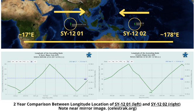 17 Apr 2024: On 23 Dec 2021 (another Christmas present) China launched a LM-7A from Wenchang containing two experimental satellites, Shiyan-12 01 and Shiyan-12 02. After launch China described the purpose of the Shiyan 12 satellites as spatial environment detection and testing. There has been open source comparison with the US GSSAP mission. There was even some interesting interactions between USA270 and both satellites in 2022 (watch Video). Over the past 2+ both satellites have maneuvered along the GEO belt covering ~17°E – 178°E. The satellites travel in opposite directions and operate independently. Observers (notably the Palski Report) have noted occasional close (but always safe) encounters between the SY-12 satellites and other satellites they encounter during their travels. Thanks to the help of LSAS (Robin!) we were able to take a closer look at 4 of these recent encounters, specifically looking at the Solar Phase Angle (SPA) and whether China may have optimized the SY-12’s for optical imaging operations. Our results were largely inconclusive given our data limitations.